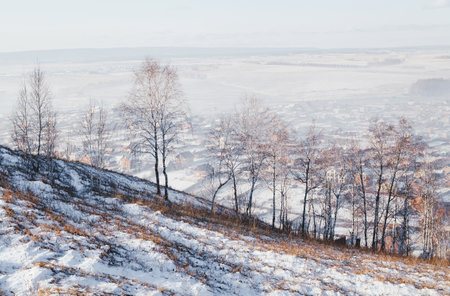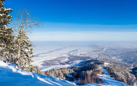 View from Tserkovka mountain to the resort town of Belokurikha in winter, Altai, Russia