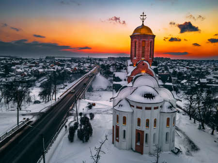 Aerial view of the church in snow-covered small european city at bright winter sunset