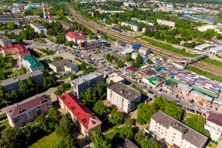 Aerial view of the train station and urban development of Balabanovo city, Russia - June 2021
