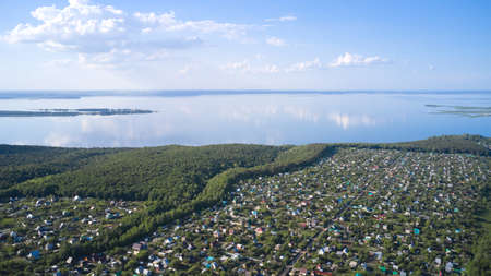 Garden cooperative in a picturesque place on the river bank. Shooting from a drone.