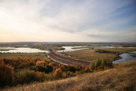 View of hills and steppe and a modern bridge over upper river Don in Russia.