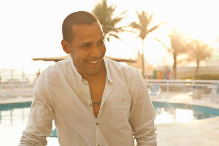 Mid adult man at hotel swimming pool, Rio De Janeiro, Brazil