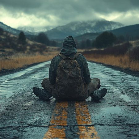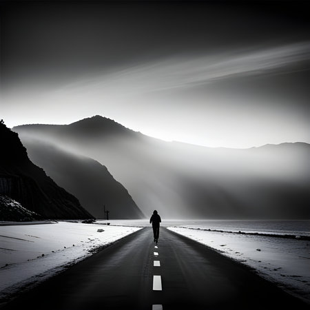 A solitary figure walks down a long, winding road, disappearing into the distance. The road is empty and straight, suggesting a journey of unknown destination. The surrounding landscape is characterized by the cloudy sky, distant mountains, and a wire fence bordering the road. The photo captures a sense of solitude and contemplation, as the figure walks towards the unknown.