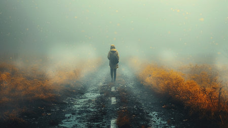 A mysterious figure standing on a road in the countryside. On an atmospheric winters day. With a grunge, textured edit.