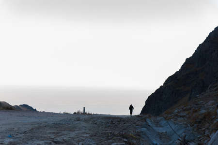 Alone man tourist with backpack walking by coastline, meeting mornin with beautiful golden sunrise