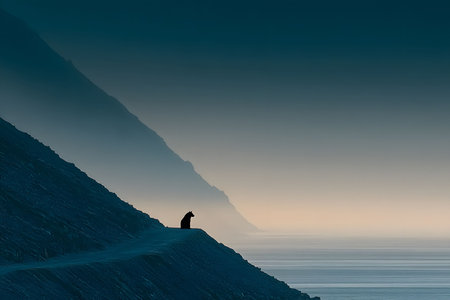 lonely dark figure sitting at a lake in winter with ice on the water