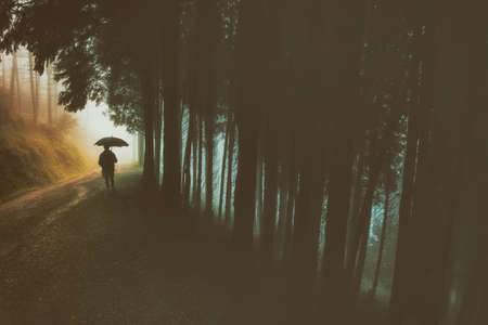 The man walking in the forest with thick fog. Drawing by digital technique
