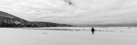 Lonely man on the beach. Black and white photo.