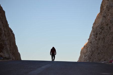 A man walking down a road towards a mountain sunset