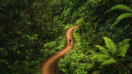 Forest path lined with ferns and morning mist for fresh trail run vibe
