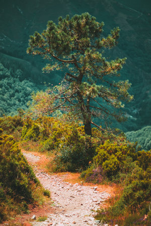 Scenic autumn section of Camino de Santiago Primitivo in Asturias, Spain, with rocky hiking trail, solitary pine tree and lush green mountain valley in the background