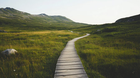 A beautiful wooden pathway winds through endless green hills and fields, offering a tranquil escape into nature with a serene ambiance and stunning landscapes.