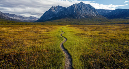 This illustration captures a peaceful mountain path lined with an array of colorful wildflowers in shades of purple, yellow, and pink. The scene is bathed in soft, warm light, enhancing the tranquil mood and inviting the viewer into a serene natural environment. Ideal for use in wellness and relaxation-themed projects. AI-generated illustration.