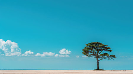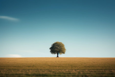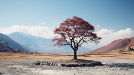 A lone tree stands in a barren desert landscape. The sky is clear and blue, and the tree is the only sign of life in the vast, empty space. Concept of loneliness and isolation