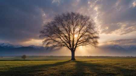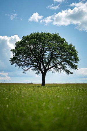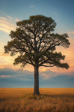 Impressive tree standing alone in a vast expanse of grassland, symbolizing solitude and timeless natural elegance.