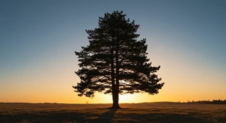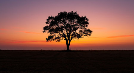 Stunning silhouette of a solitary tree against a vibrant sunset sky. This serene landscape embodies tranquility and natural beauty, perfect for calming visuals.