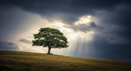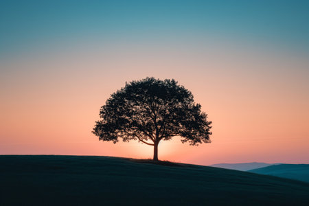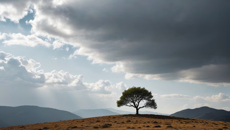 A solitary tree majestically rises on a hill showcasing nature's tranquil beauty.