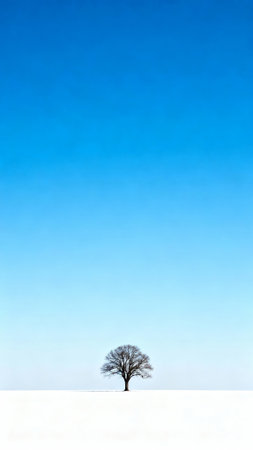 Vast snowy plain with a single tree for minimalist winter themes. A barren tree stands alone in the middle of an endless snowy