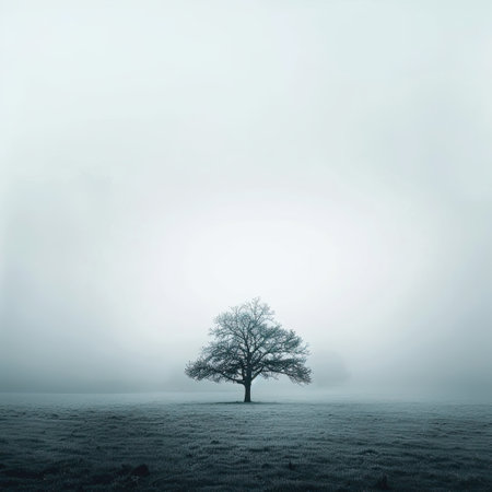 lone tree standing in a foggy landscape, with mist swirling around its branches, creating a mysterious atmosphere