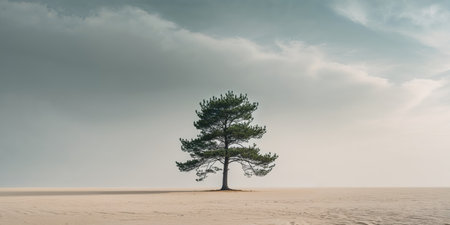 AI Generated. Lonely pine tree growing on sandy ground under cloudy sky