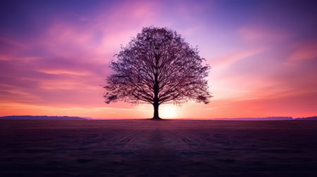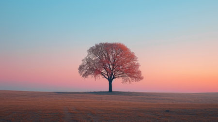 A minimalistic nature landscape with tree surrounded with desert at sunset with pink and blue background. A fantasy tree with magical view surrounded with grass area. Neutral image concept. AIG42.