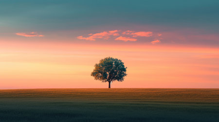 A stunning solitary tree stands silhouetted against a colorful sunset sky, capturing the essence of tranquility in nature's vibrant display. Perfect for serene landscapes.