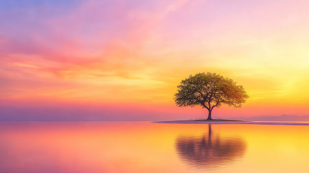 Captivating scene of a solitary tree by a still body of water, reflecting the colors of the sunset, creating a tranquil and serene atmosphere in nature.