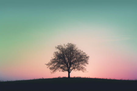 Lonely tree silhouette standing on hill against colorful sunset sky. Peaceful and minimalistic simple nature background with gradient hues