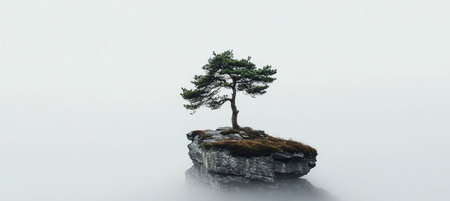 Majestic Single Tree Standing Alone on a Weathered Stone Surrounded by Ethereal Mist and Serenity