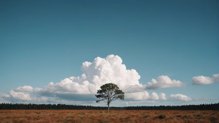 Solitary tree on a golden hill under a vast blue sky with fluffy white clouds, peaceful nature scene. Serenity and isolation concept