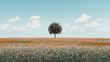 Minimalistic Outdoor Scene Featuring a Solitary Tree Against a Clear Blue Sky. Generative AI. high quality illustration