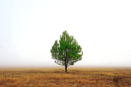 A solitary green pine tree stands gracefully in a fog-covered brown field, showcasing a serene and tranquil landscape. Ideal for nature-themed projects.