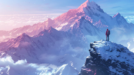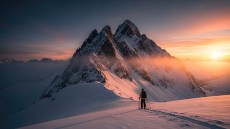 A Majestic Mountain Climber Celebrates Their Achievement at Sunrise Amidst Natures Beauty
