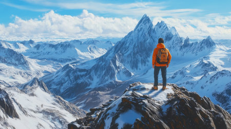 Solo Mountaineer Standing on Snowy Peak Overlooking Mountain Range Under Blue Sky. High quality photo