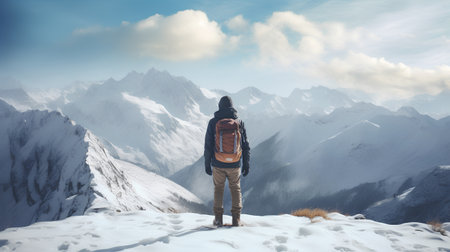 Man standing on the top of a snowcapped mountain peak. Panoramic view.Generative AI