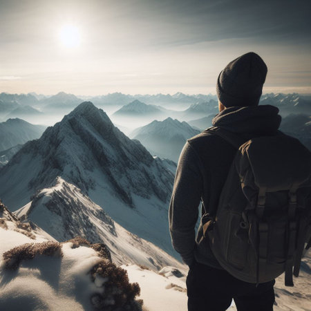 Rear view of a solitary person on a snow covered mountain summit, gazing at a breathtaking panorama of peaks rising above a sea of clouds on a clear winter day.