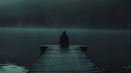 A solitary person sits quietly at the edge of a fog covered bridge, surrounded by an atmosphere of solitude and mystery during early morning.