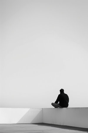 A lone figure sits quietly on the edge of a fog covered bridge, immersed in thoughts of loneliness and introspection during twilight.