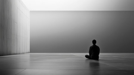A man sits in a room with a wall in the background. The room is empty and the man is alone. AI generated.