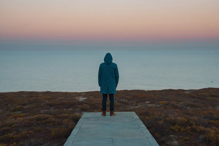 Desolate individual gazing out to sea isolated on a blue gradient background