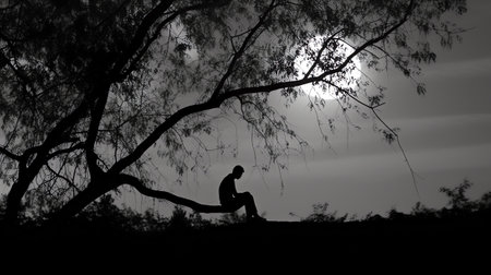 A stark black silhouette of a person sitting on a bench, hunched over in thought next to a large, leafless tree with intricate branches against a foggy, pale background.