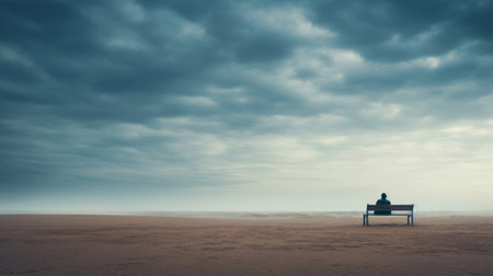 a person sits on a bench beneath threatening clouds in the sky, reminiscent of the desolate landscapes found in the works of ahmed morsi and andreas levers. this uhd image captures the essence of desertwave, showcasing layered and atmospheric landscapes with an atmospheric abstraction. ai generated