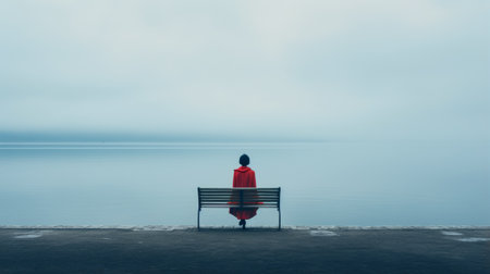 a woman sits on a bench, gazing at the water in a misty atmosphere. the photo captures the essence of japanese minimalism with its dark cyan and red tones. the image exudes powerful and emotive portraiture, showcasing minimalistic symmetry. this uniformly staged image is presented in stunning 8k resolution. ai generated