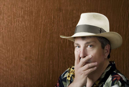 Portrait of a Man in a Flowerd Shirt with his Hand in Front of his face