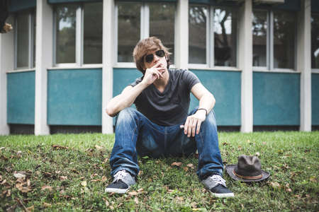 Man in cap and glasses sitting on the field, young man in glasses sitting on the grass in the field