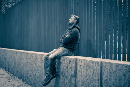 Young attractive man suffering from depression stress sitting alone and sad on the street feeling anxious and lonely in unemployment Mental health Drug and alcohol addiction concept.