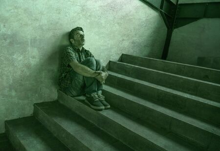 dramatic portrait of young depressed and desperate man sitting outdoors on dark grunge street corner staircase feeling sick suffering depression problem and anxiety crisis in mental health concept