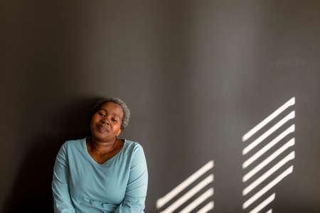 Relaxed african american senior woman sitting at wall in ray of light. retirement lifestyle, spending time at home.
