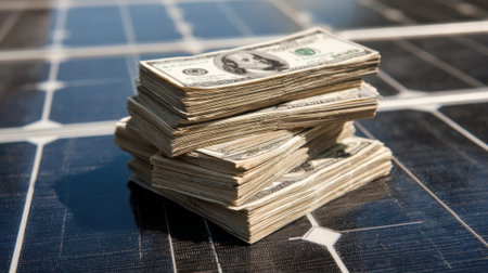 Stacks of cash are positioned on solar panels under bright daylight, symbolizing financial investment in renewable energy and the growing importance of sustainable practices.