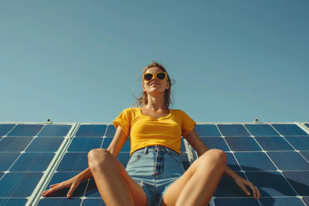 A woman in a yellow shirt and sunglasses sits on a row of solar panels, gazing up at the clear blue sky.